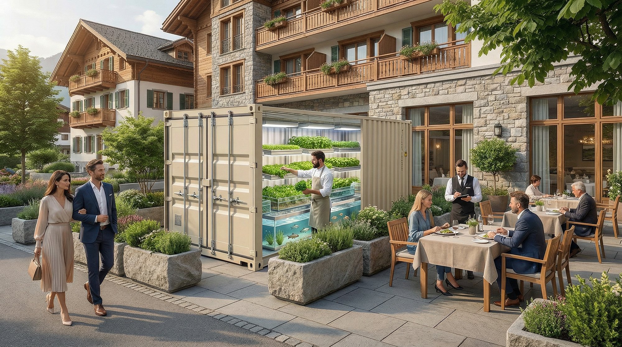 Hotels, Resorts und Kreuzfahrtschiffe nutzen die BlueGreens BOX als On-Site-Farm. Sie produziert Microgreens, Kräuter oder Fisch direkt für die Küche – sichtbar für Gäste.
